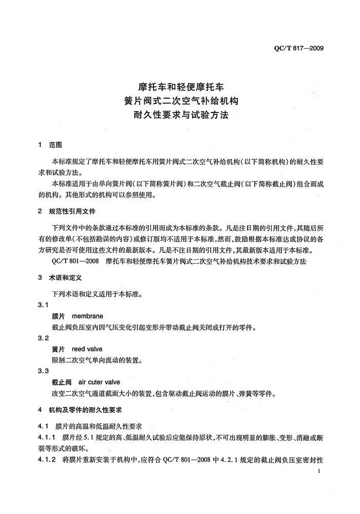 《摩托車和輕便摩托車簧片式二次空氣補給機構耐久性要求與實驗方法》QCT817-2009