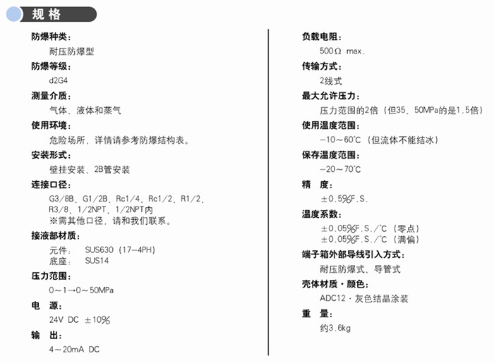 耐壓防爆結構,其壓力感應部采用半導體應變片并提供有內置線圈的防爆箱。