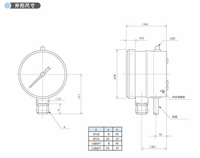 本產品是小型帶接點壓力表,內置了可靠性的光電開關,主要用于控制報警輸出和繼電器的開關等